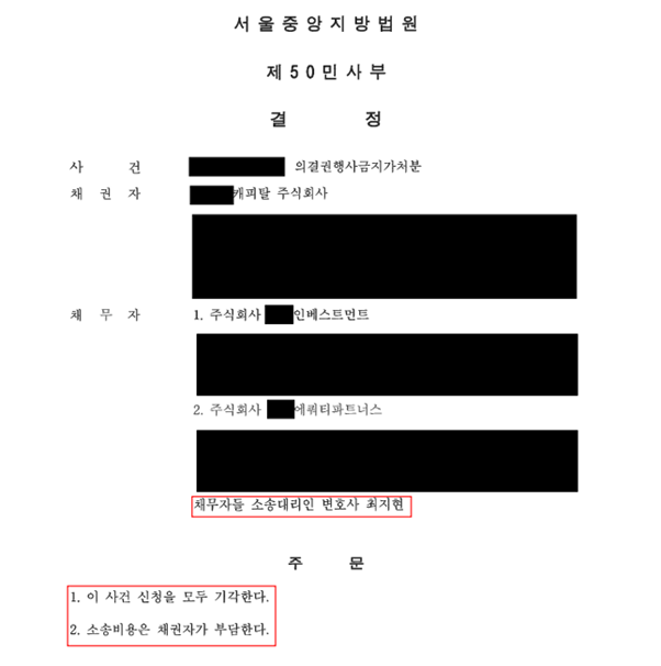 결과적으로 법원은 최지현 변호사의 주장과 법리를 완벽히 수용하여 무궁화캐피탈의 가처분 신청을 모두 기각했습니다. 본 승소는 명확한 사실관계 파악과 깊이 있는 법리적 접근이 이끌어낸 결과입니다. 사건의 승소여부는 소송적 기교로 결정되는 것이 아닙니다. 변호사가 얼마나 그 사건의 사실관계를 충실히 이행하고, 탄탄한 법리로 논점을 타파하는지 여부, 즉 변호사의 실질적인 실력으로 결정되는 것입니다.
