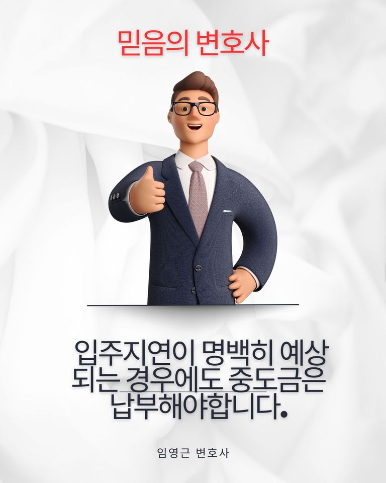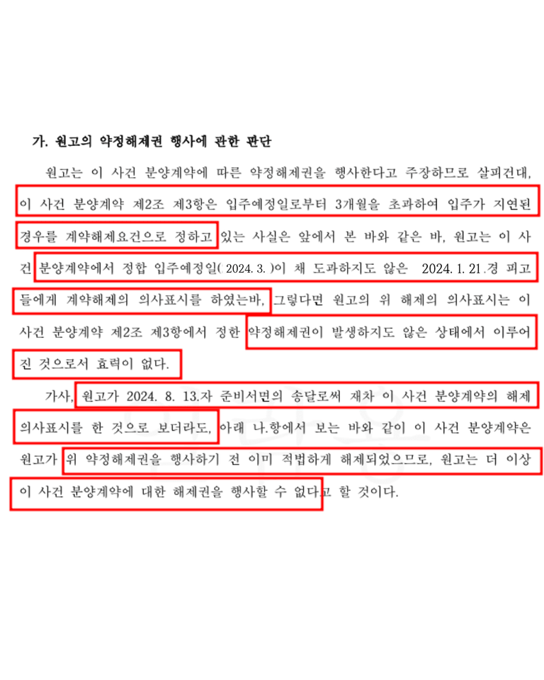 이 사건을 담당하신 변호사님은 입주예정일이 도래하기도 전에 입주지연 계약해제 통보를 하였고, 이에 대한 법원은 당연히 그 효력을 인정하지 않았습니다.