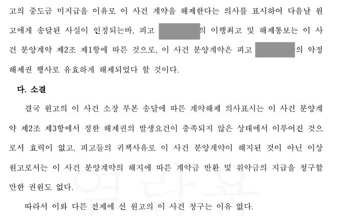 반면, 상대방 매도인의 중도금 납부 이행지체에 따른 해제권은 수분양자가 중도금 납부기일에 납입을 하지 않아 매도인이 공급계약에서 정한 대로 이행최고를 하였을 경우에 발생합니다.