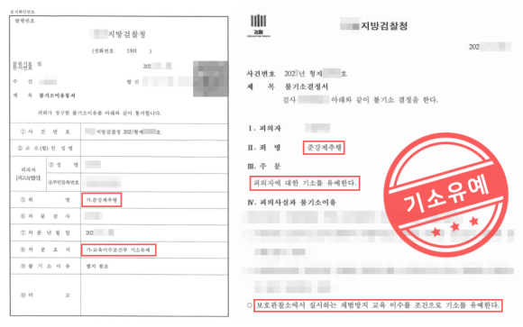 : 혐의를 인정하였기에 경찰에서는 사건을 검찰로 송치하였고, 이를 검토한 검사의 판단으로 피의자에게 '기소유예 ' 처분이 이루어지면서, 의뢰인은 형사재판을 받지않고 사건을 마무리하여 일상으로 돌아갈 수 있게 되었습니다.