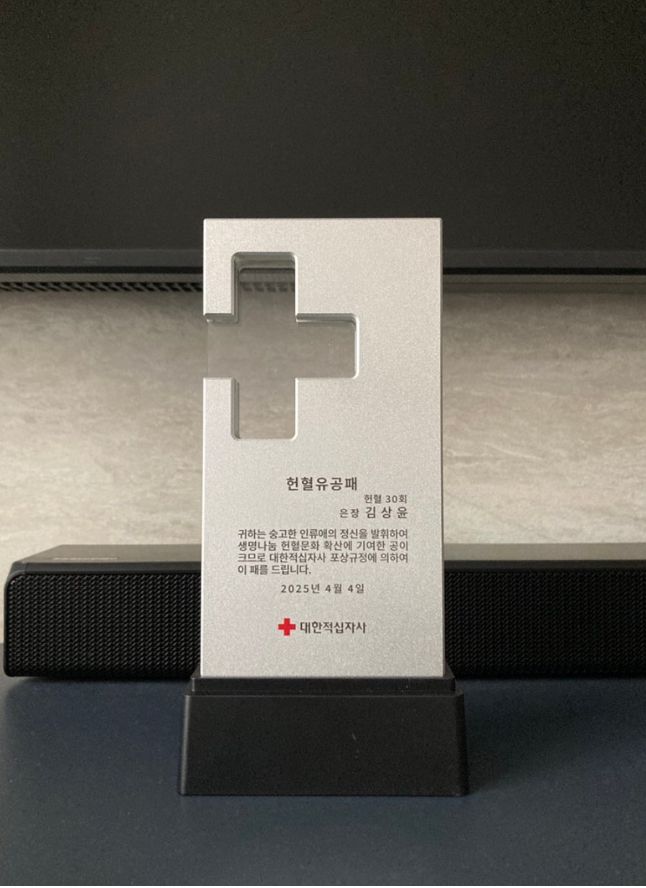 그 결과 대한적십자사로부터 ‘헌혈유공 은장’을 받게 되어 감사한 마음을 전합니다.