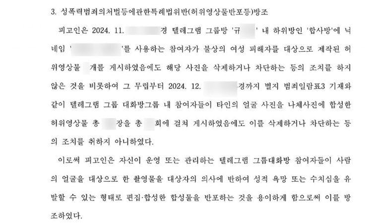 해당 의뢰인은 2024년 11월경 텔레그램 합사방 '규XX 방'을 개설·운영하며, 허위영상물 편집 및 반포, 나아가 방조 혐의까지 함께 기소되었습니다.