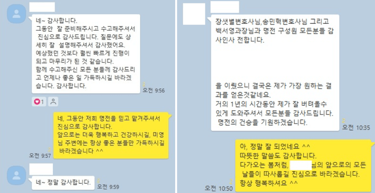 "장샛별 변호사님을 택한 건 최고의 선택, 다른 의뢰인들도 도움받기를 바랍니다."