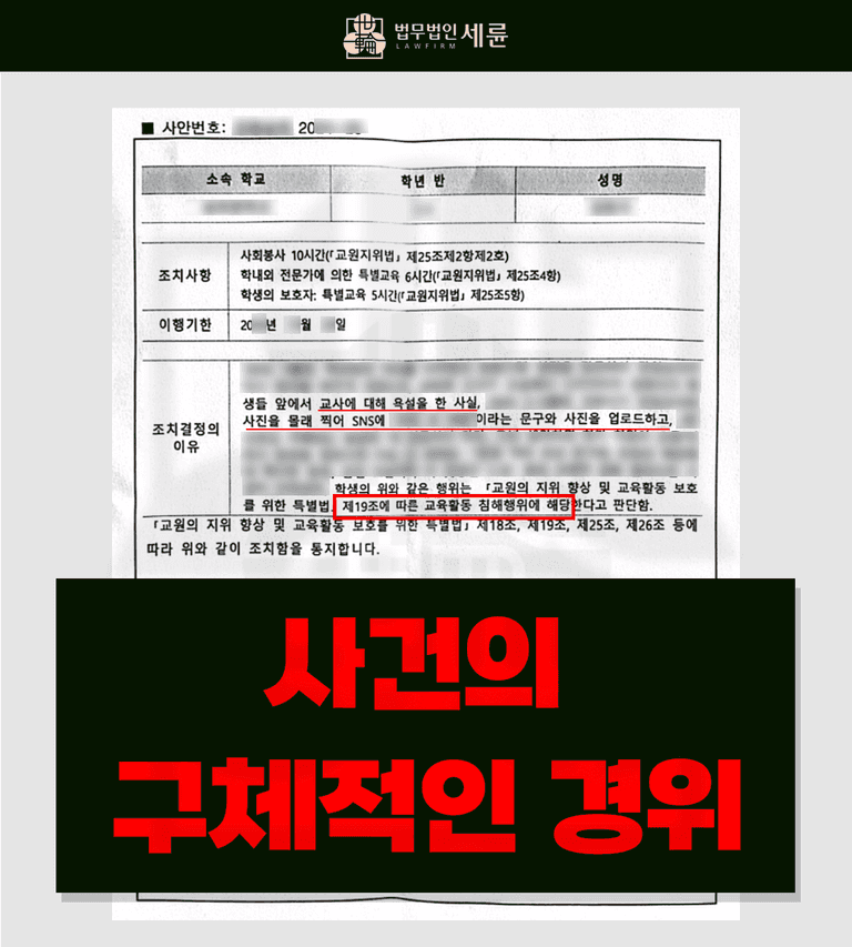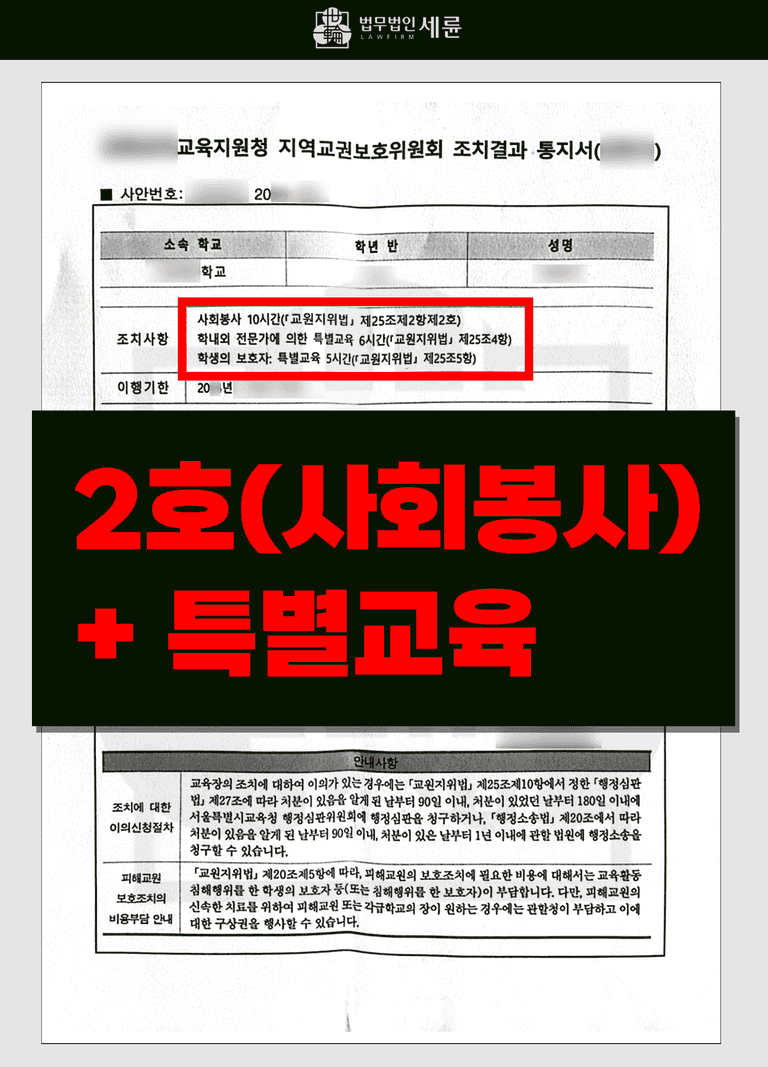 실제로 해당 사안은 심각했고, 심지어 교사의 권리를 침해한 학생 A는 피해 교사의 반 소속이었기 때문에 5호 이상의 높은 처분이 내리질 가능성이 있었습니다. 그러나 학폭사건변호사의 체계적이고 전략적인 판단과 대처로 5호(학급교체)보다 훨씬 낮은 2호(사회봉사)를 받을 수 있었습니다. 앞서 언급했듯이, 해당 사례는 심각성, 지속성, 관계 회복성 기준에서 높은 점수를 피할 수 없었던 상황이었지만, 저희 세륜의 전문적인 노하우로 낮은 2호 조치를 받을 수 있었습니다. ※교권보호위원회 사회봉사(2호)는 학폭위 사회봉사(4호)와는 달리 매우 낮은 수준의 처벌에 속합니다.