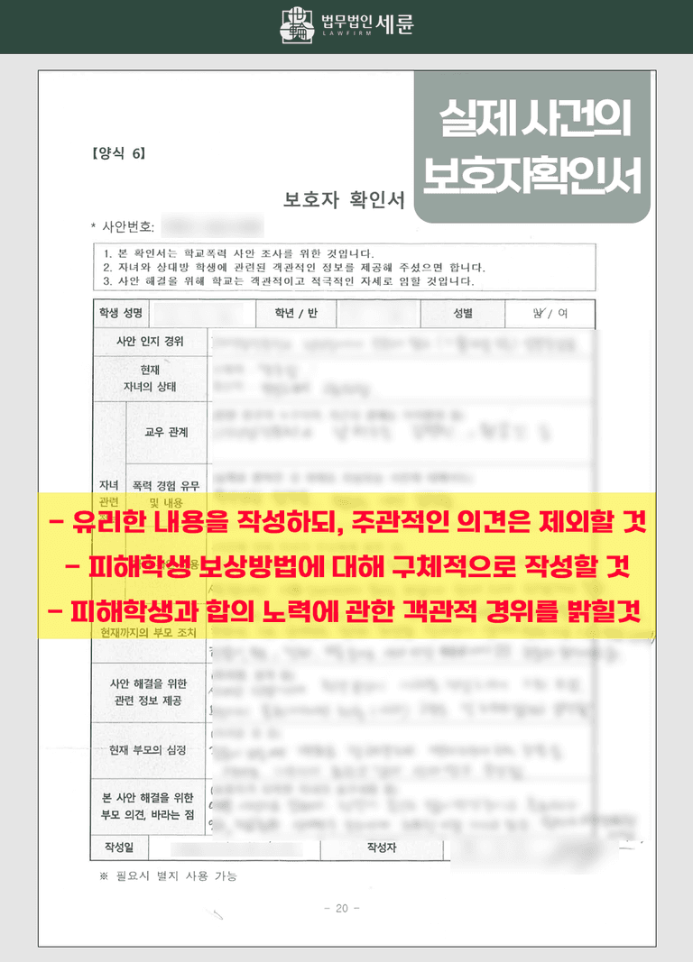 학교폭력 사건이 발생하면 피해 학생과 가해학생은 각각 ‘학생확인서’를 작성해야 하는데요. 양 측의 보호자 역시 ‘보호자확인서(학부모확인서)’를 작성할 것을 요청받습니다. 특히 가해학생 측의 보호자라면 이 확인서를 정말 신중하게 채워나가야 하는데요. 학교폭력대책심의위원회(이하 '학폭위')에서는 학부모확인서를 자녀에 대한 처분을 결정하는 중요한 자료로 활용하기 때문입니다. 어떤 경우는 확인서에 한 줄의 실수라도 있을 경우, 추후 억울한 상황을 초래할 수도 있지요.