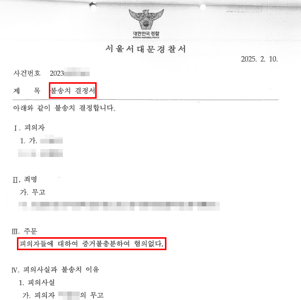 경찰은 본 변호인의 의견을 받아들여 의뢰인에 대하여 불송치결정을 하였습니다.
