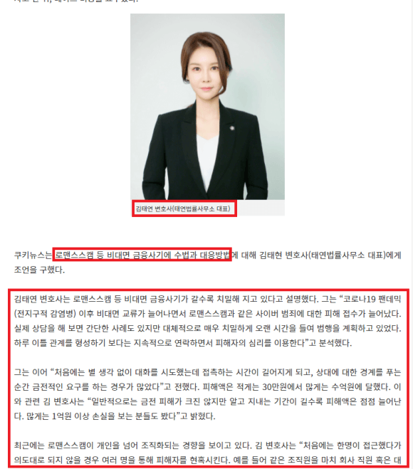 아래는 보이스피싱전문변호사이신 김태연대표변호사님의 능력을 눈여겨 본 언론에서 관련 인터뷰를 진행한 내용인데요. 일부를 공유드리니, 참고하시길 바랍니다.