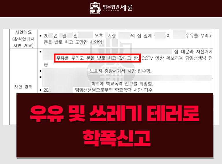 중학교 1학년 학생이었던 A는 학교를 마치고 집에 돌아갔다가 깜짝 놀랐습니다. 집 앞에는 쓰레기 더미들이 흩뿌려져 있었고, 집 대문과 자전거에는 누군가가 우유를 뿌려놓아서 우유범벅인 상태에 악취가 코를 찌를 정도로 심하게 났던 것입니다. 그리고 몇 분 뒤 누군가가 대문을 발로 차고 간 것인데요. 당황한 A는 당최 누구의 소행인지 알 수도 없는 상태에서 심각한 두려움을 느꼈습니다. A는 부모님께 사실을 알리고 CCTV 영상을 확보하여 담임선생님께 전송을 했습니다.