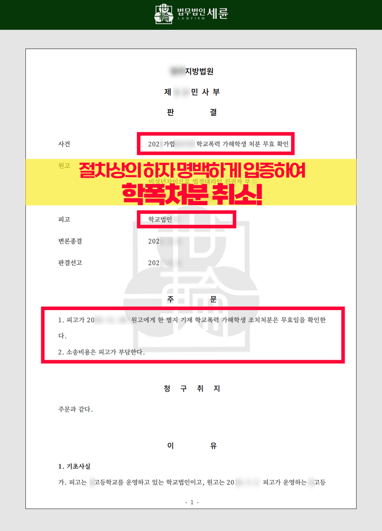 위와 같은 주장을 종합했을 때, 학폭위가 정당한 절차에 따라 진행되었는지 의문이라며, A 군에게 내려진 학교폭력처분은 과중하여 위법하므로 취소되어야 한다고 피력했습니다. 이러한 대응으로 결국 법원은 “이 사건은 단순한 말다툼이나 갈등의 연장선일 뿐, 정신적 피해를 동반하는 ‘학교폭력’으로 보기는 어렵다”고 결정했습니다. 그리고 학폭위의 절차상 하자가 있다는 점에서, A군에게 내려진 징계 조치는 무효라고 판결했습니다. 학교폭력처분 무효소송에서 승소한 덕분에 A 군은 학폭 가해학생이라는 누명을 벗고, 생기부에서도 학폭처분을 받은 사실을 삭제할 수 있게 되었습니다.