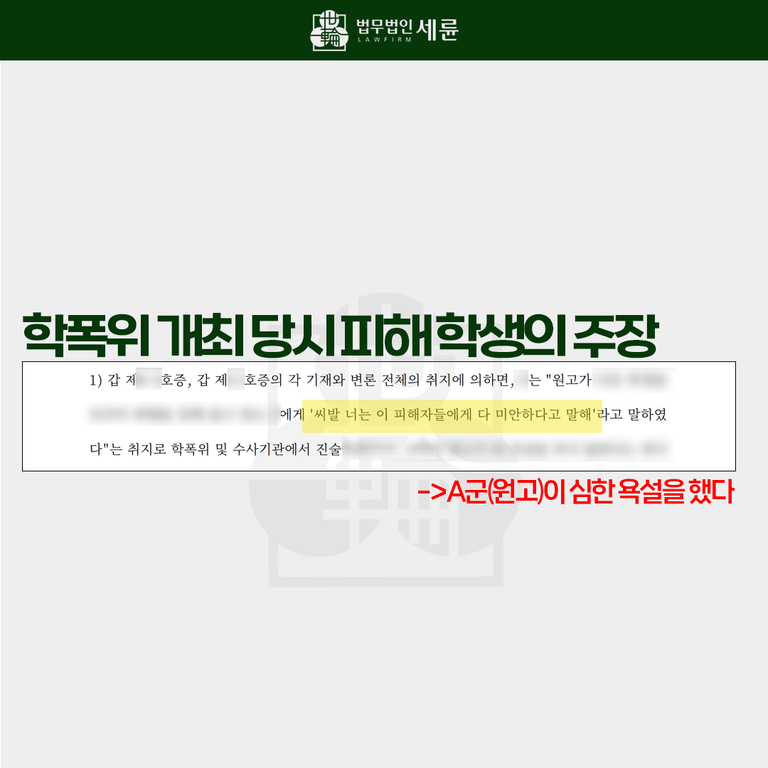 사례로 돌아와 실제 사례에서 구체적인 대응방법은 어떠했는지 살펴보겠습니다. A 군(원고)은 일단 피해 학생에게 욕설을 한 적이 없고, 따라서 피해 학생이 허위 사실을 말한 것이라고 주장했습니다. 실제로 A 군이 욕설하는 것을 들었다는 명확한 증거나 제3자의 일관된 진술이 없었고, 오히려 “A군이 욕설하지 않았다”는 진술서들이 제출되었다는 점을 밝혔습니다. 그리고 설령 피해학생에게 욕설을 했다고 해도, 상황상 언어폭력으로 보기 어렵다고 강조했습니다.