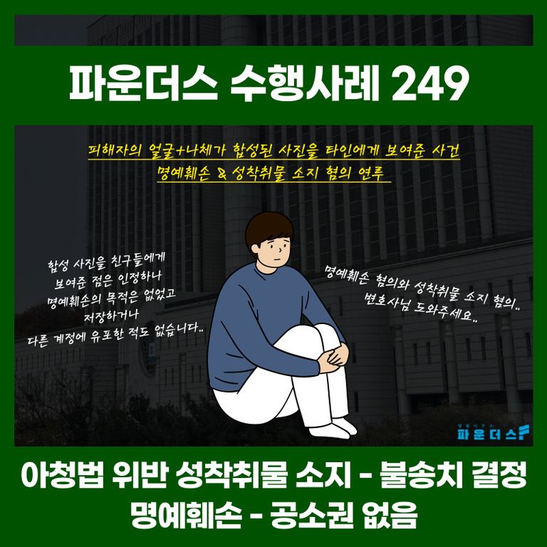 이 같은 사실관계로 피해자는 의뢰인이 합성물을 제작했다 오해를 하였고 동시에 합성물을 타인에게 보여준 점 그리고 이를 소지하고 있던 점에 대하여 명예훼손 혐의와 성착취물 소지 혐의로 고소를 당한 것입니다.