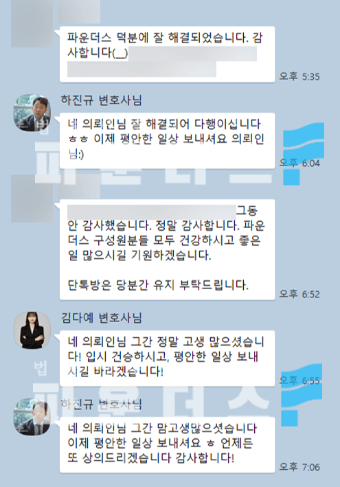 더하여 본 사건 이외에 다른 사안까지 적극적인 조력을 드렸고 원만한 해결에 이르러 의뢰인분께서 감사의 마음을 표하셨습니다.