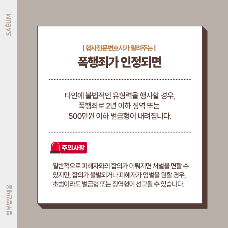 타인의 신체에 대해 불법적인 유형력을 행사할 경우, 폭행죄로 2년 이하의 징역 또는 500만 원 이하의 벌금형에 처해질 수 있습니다. 형 자체가 무거운 편은 아니지만, 사건의 경위나 피해자의 의사에 따라 처벌의 강도는 달라질 수 있습니다.