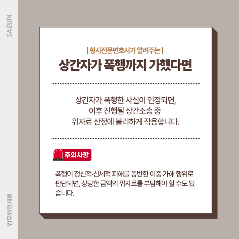 특히 상간녀의 입장에서 폭행까지 가한 사실이 인정된다면, 이후 진행될 수 있는 위자료 청구 소송에서도 불리하게 작용합니다. 폭행이 정신적·신체적 피해를 동반한 이중 가해 행위로 판단되면, 상당한 금액의 위자료를 부담해야 할 수도 있습니다.
