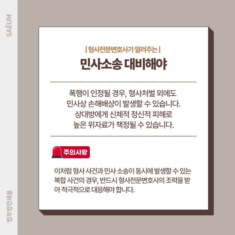 이처럼 형사 사건과 민사 소송이 동시에 발생할 수 있는 복합 사건의 경우, 반드시 형사전문변호사의 조력을 받아 적극적으로 대응해야 합니다. 사건 초기 대응이 늦어지거나 전략 없이 대응할 경우, 예상보다 훨씬 큰 손해를 감수하게 됩니다.