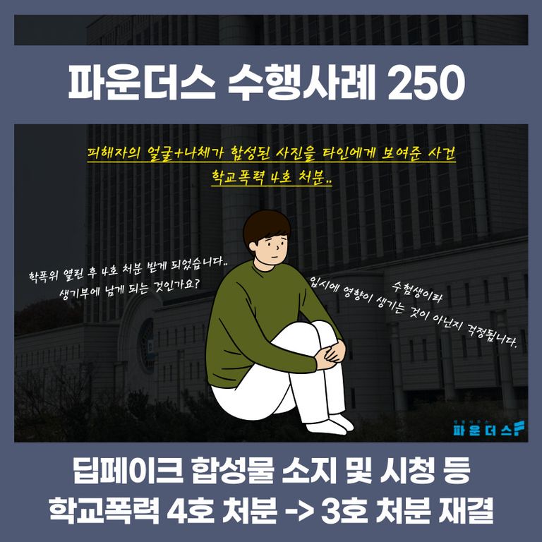 텔레그램에서 피해자의 얼굴과 나체 사진이 합성된 딥페이크 합성물을 접한 뒤 이를 같은 반 친구들에게 보여준 의뢰인은 학폭위의 대상이 되었습니다.