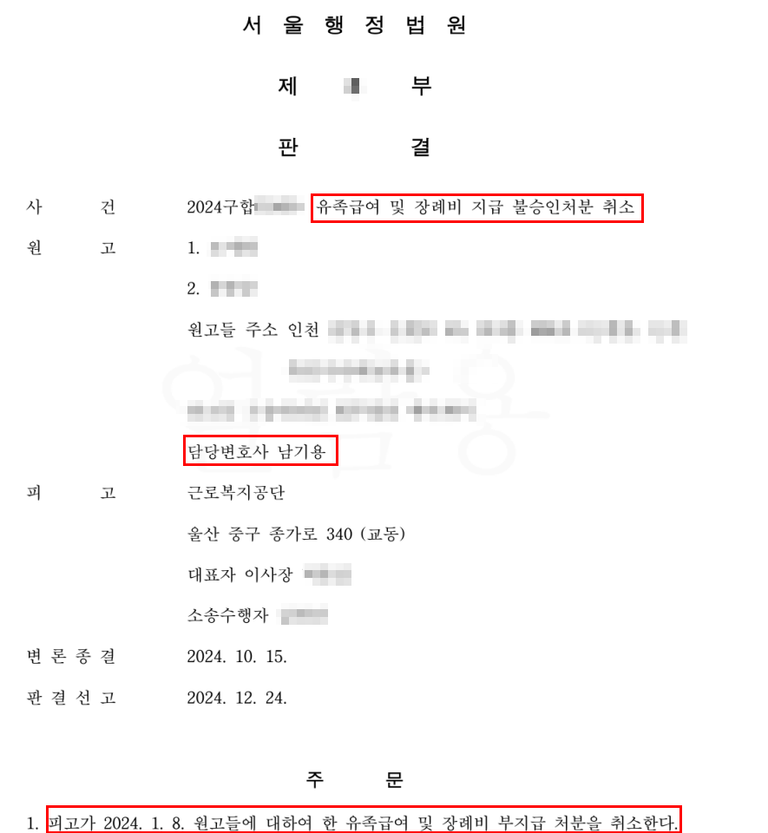 법원은 남기용 변호사의 의견을 받아들여서 근로복지공단의 유족급여 및 장례비부지급처분취소는 위법하므로 취소해야 한다는 판결을 선고하였습니다.
