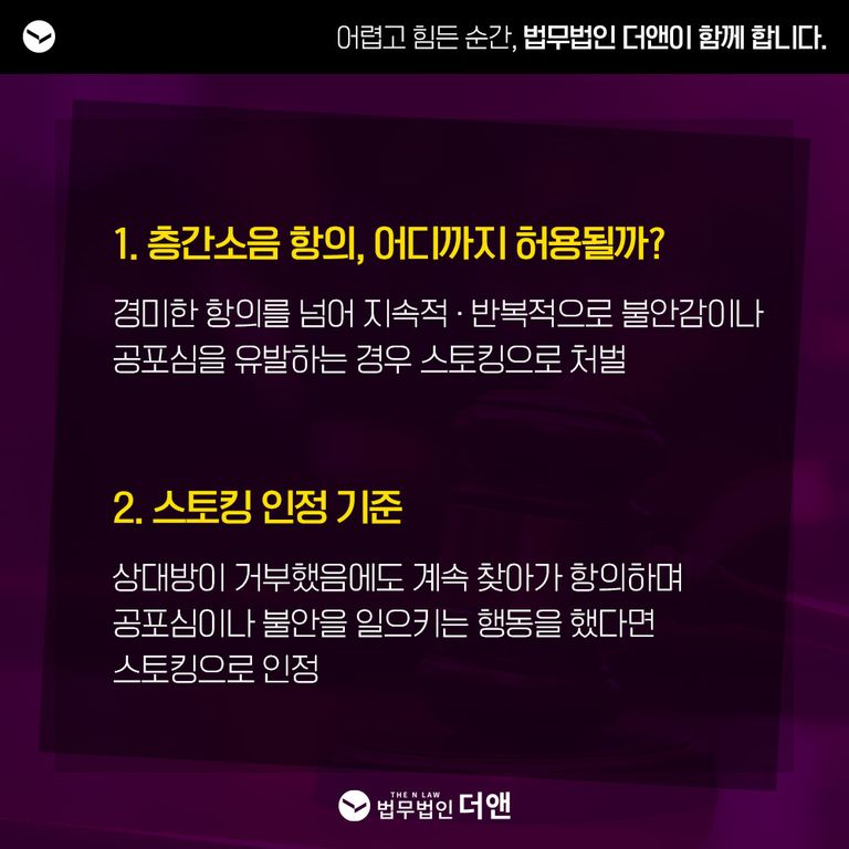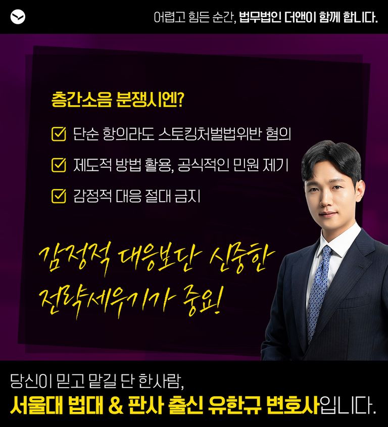 층간소음 문제로 인한 불편함은 누구나 공감할 수 있지만, 감정적으로 대응하거나 무리한 방법을 택할 경우 스토킹처벌법 위반으로 형사처벌을 받을 수 있습니다. 문제를 제기할 때에는 제도적 절차를 통해 신중하고 체계적으로 접근하는 것이 최선의 방법입니다.