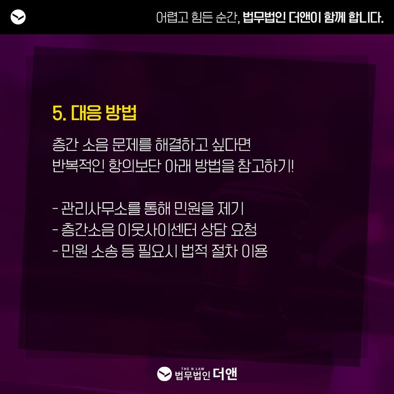 층간소음 문제를 해결하고 싶다면, ① 관리사무소를 통한 공식적인 민원 제기, ② 층간소음 이웃사이센터(국가기관) 상담 요청, ③ 필요 시 법적 절차(민사 소송 등) 이용 등 제도적 방법을 활용해야 합니다. 직접적이고 반복적인 항의는 오히려 본인이 피의자가 되는 결과를 초래할 수 있습니다.