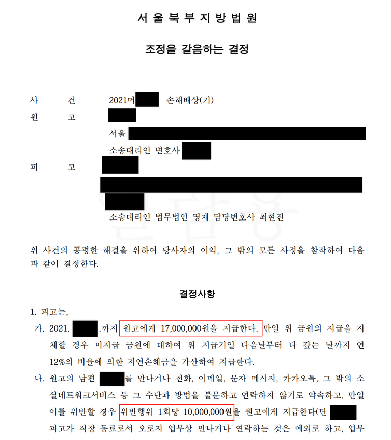 위자료 1,700만 원에 원고 남편과 연락하다 발각될 시 1회당 1천만 원의 위약벌 조항이 들어가 있습니다.