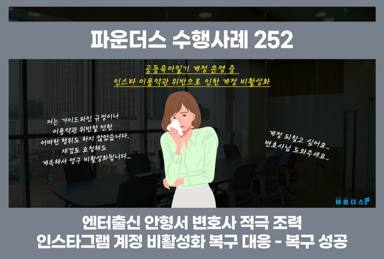 인스타그램으로 공동 육아 일기를 기록하며 인플루언서 활동으로 계정을 성장시켜오던 의뢰인은 갑작스러운 계정 비활성화에 변호인의 조력을 요청하였습니다.