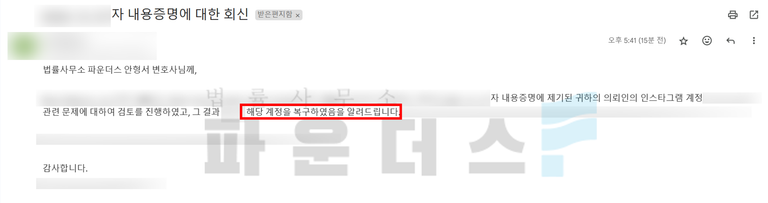 이에 의뢰인 홀로 인스타그램 측에 재검토 요청 메일을 전송해도 받아들여지지 않았던 때와 달리 변호인 명의의 내용증명 발송 이후 계정이 원만히 복구되어 계정 활동을 이어갈 수 있게 되었습니다.