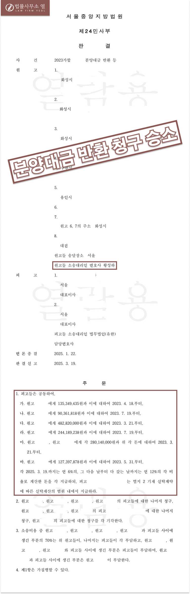 이에 법률사무소 열의 황성하 변호사는 의뢰인들을 대리하여 시행사에게 내용증명을 보내어 분양계약 해제통보를 하고, 시행사, 시공사, 신탁사를 피고들로 하여 ‘입정예정일로부터 3개월이 지난 시점까지 입점할 수 없을 정도로 공사가 지연되었다. 분양계약에 따라 원고들은 분양계약을 해제하였다. 피고들은 공동하여 원고들에게 이미 지급받은 분양대금과 법정이자 내지 지연손해금을 지급하라.’는 소송을 제기하였습니다.