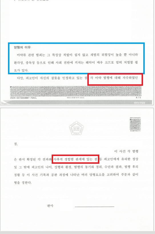 마약류관리법 위반 동종전과자, 자수와 후단 경합범 주장해 집행유예 선처받은 실제사례