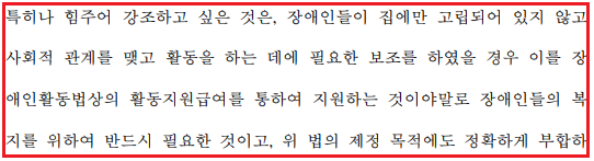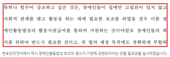 이에, 장혜진 변호사는 "장애인활동법에서는 활동보조의 장소를 '가정'으로만 한정하지 않고 있을 뿐만 아니라, 수급자가 활동지원급여를 받거나 활동지원기관이 활동지원급여를 제공할 때에 요구하거나 제공하여서는 아니되는 행위를 규정한 장애인활동법 제16조와의 대비를 통하여서도 활동보조의 장소를 가정에 국한하지 않다고 해석하는 것이 타당하다고 주장하였습니다.