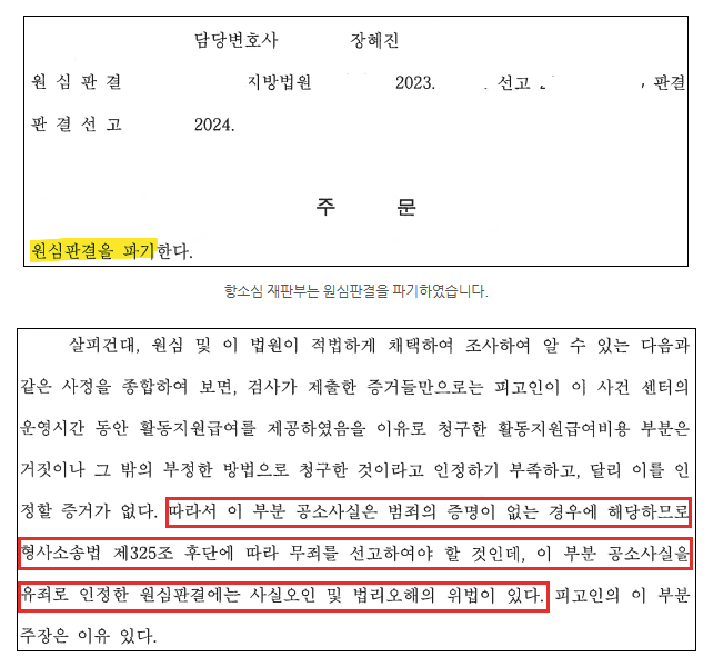 항소심 재판부는 장혜진 변호사의 주장을 그대로 받아들여, 원심판결을 파기하고 공소사실 중 일부에 대하여 무죄를 선고하였습니다. 앞서 말씀드린 바와 같이, 형사재판에서 무죄를 선고받을 확률은 1%도 채 안되고, 더구나 1심에서 공소사실을 모두 인정하였으나 항소심에서 이를 번의한 경우라면 무죄를 선고받을 가능성이 더욱 희박합니다. 9년간의 활동지원급여를 대상으로 한 사건이므로 기록이 방대하였고, 무엇보다 수사기관과 1심 재판부도 제대로 이해하지 못한 장애인활동법의 구조에 대해 이해하기 쉽게 해석하고 설명하는 것에 어려움이 있었습니다. 그러나 장혜진 변호사는 '기본으로 돌아가라'는 말 처럼 근거 법규의 해석에서부터 사건의 핵심을 찾았습니다. 또한 의뢰인 및 의뢰인의 동료들과의 끈질긴 소통을 통하여 장애인활동지원급여 실무를 모두 꿰뚫었고, 이를 근거로 항소심 재판부를 더욱 논리적으로 설득할 수 있었습니다. 본 사건은 의뢰인과의 소통이 사건 해결에 실마리를 찾을 수 있었던 사례임과 동시에 관련 법규의 해석이 사건 진행에 얼마나 큰 영향력을 행사하는지를 여실히 보여준 사례라고 할 수 있겠습니다.