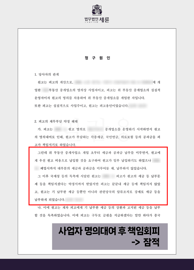 🚨 법무법인 세륜은 10년 경력의 대한변협등록 민사전문 변호사가 상담부터 재판 끝까지 책임지고 전담하고 있습니다. 사업자명의대여 세금미납과 관련된 법무법인 세륜의 실제 해결사례를 소개합니다.