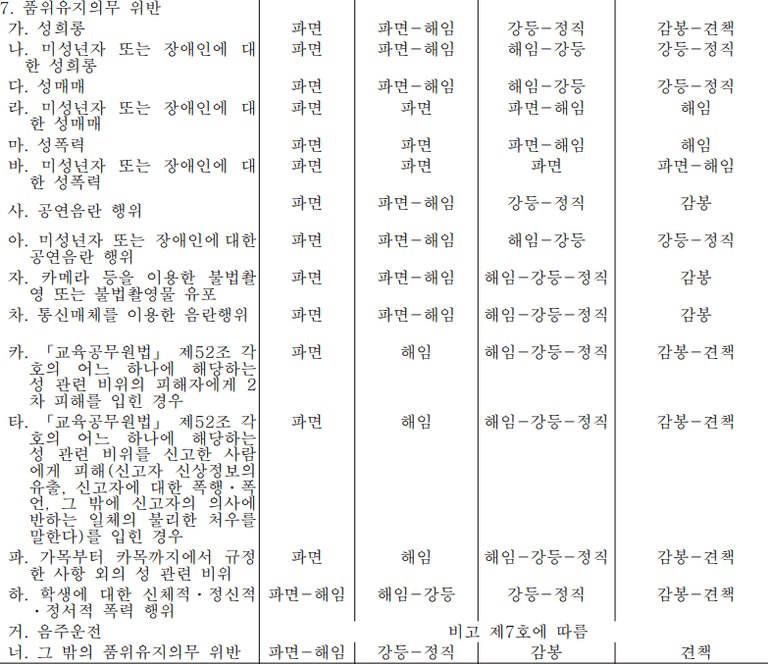 정부는 국공립 교원의 성비위 징계기준을 세분화, 강화하고 사립교원의 징계수준도 이에 준하도록 사립학교법 등 관련 법령을 개정하기도 하였습니다.