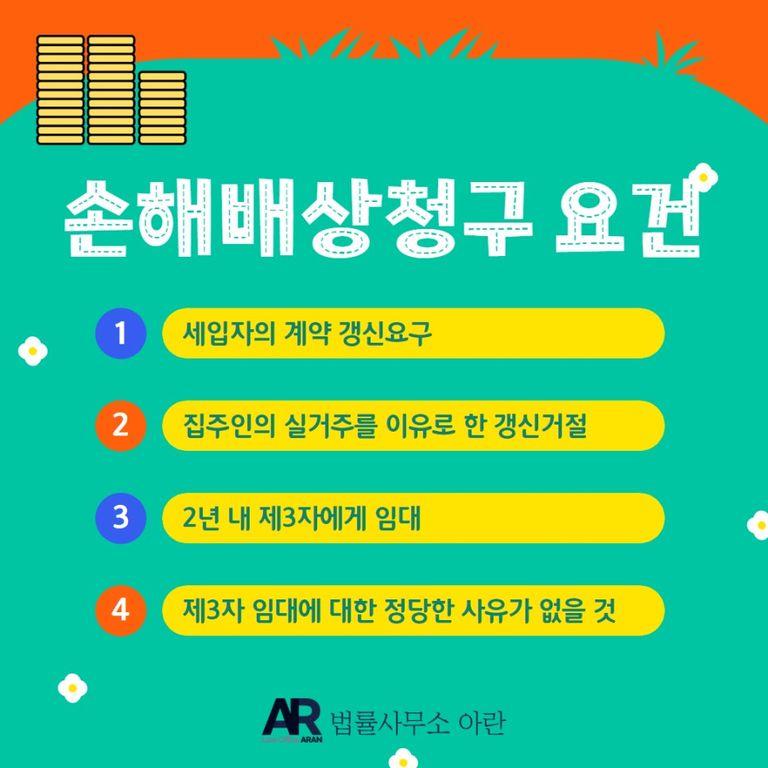 이럴 때 주택임대차보호법과 판례는 세입자의 손해배상청구권을 인정함으로써 세입자의 계약갱신요구권을 실질적으로 보장하고 있습니다.