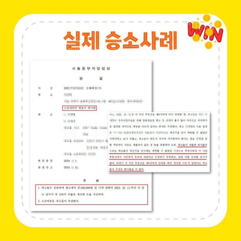 위와 같은 내용들이 충족되면 세입자는 집주인을 상대로 손해배상을 청구할 수 있습니다. 실제로 법률사무소 아란에서 집주인을 상대로 손해배상을 청구하여 3,760만 원의 손해배상을 받아낸 사례를 살펴볼까요?