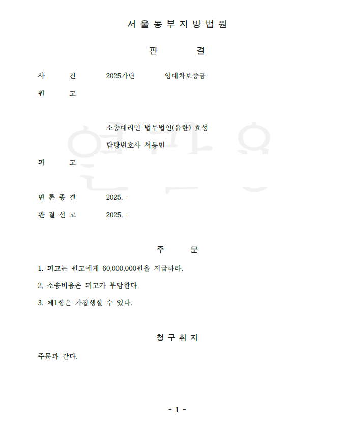 저는 즉각 피고를 상대로 임차보증금반환청구소송을 제기하였고 법원은 원고 승소 판결을 선고하여 의뢰인은 임차보증금을 반환받았습니다.