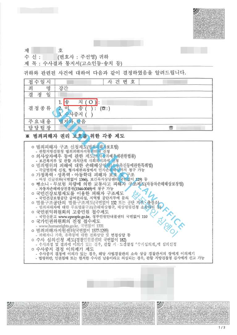 - 가해자는 경찰 조사 과정 내내 강제로 강간한 사실이 없다고 주장하며 혐의를 부인하였으나, 피해자가 피해 직후 가해자로부터 입금 받은 금전 내역과 변호사님이 제출한 고소장 및 의견서의 내용이 보다 신빙성이 높다고 판단되어 결국 사건은 검찰로 송치되었습니다.