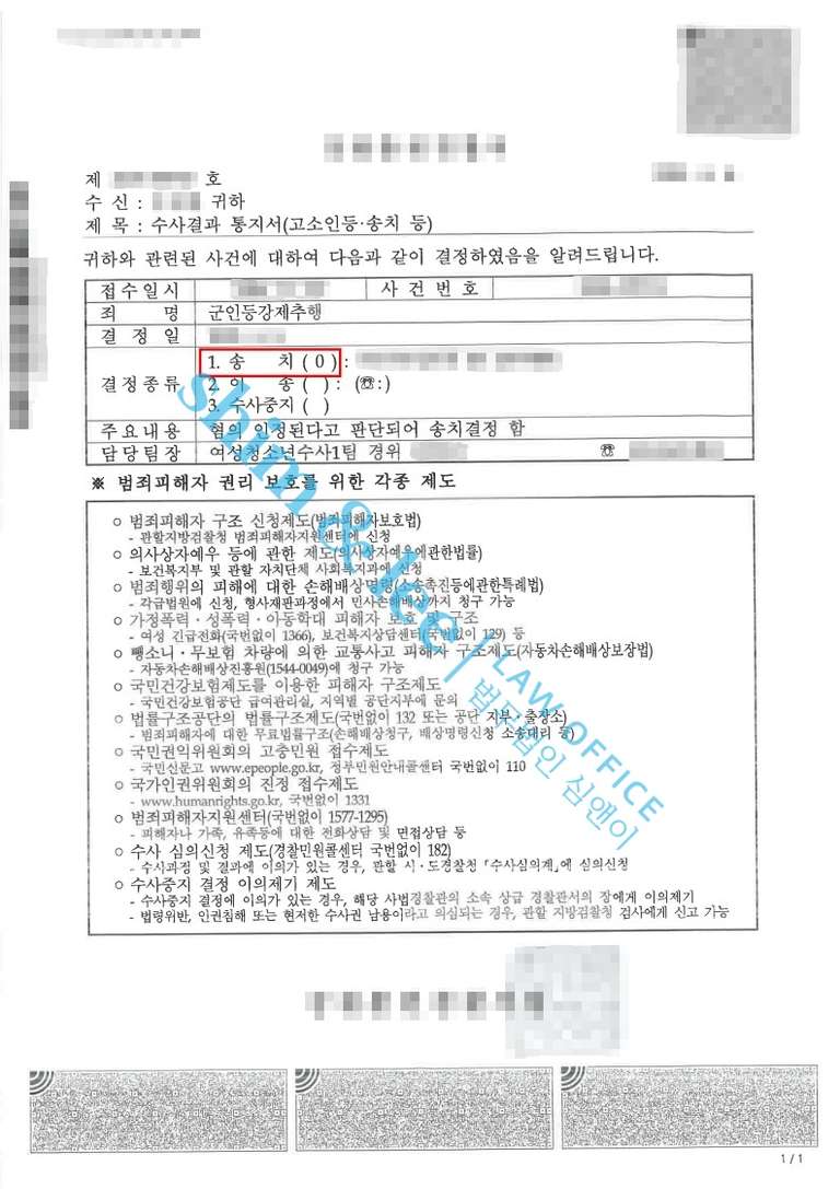-결국 가해자는 상대방의 의사에 반하여 성적 수치심이나 혐오감을 유발하는 추행을 저지른 사실이 인정되어 군인등강제추행죄로 송치되었습니다.