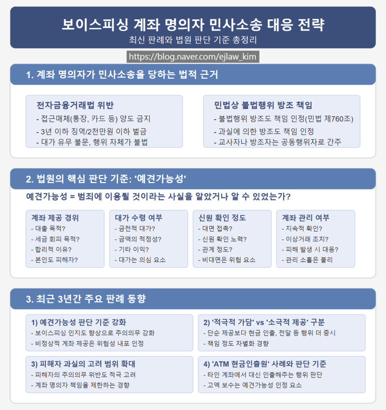 이 글에서는 보이스피싱에 이용된 계좌 명의자가 민사소송을 당했을 때 어떻게 대응해야 하는지, 최근 판례를 중심으로 승소 가능성을 높이는 전략에 대해 알려드리겠습니다.
