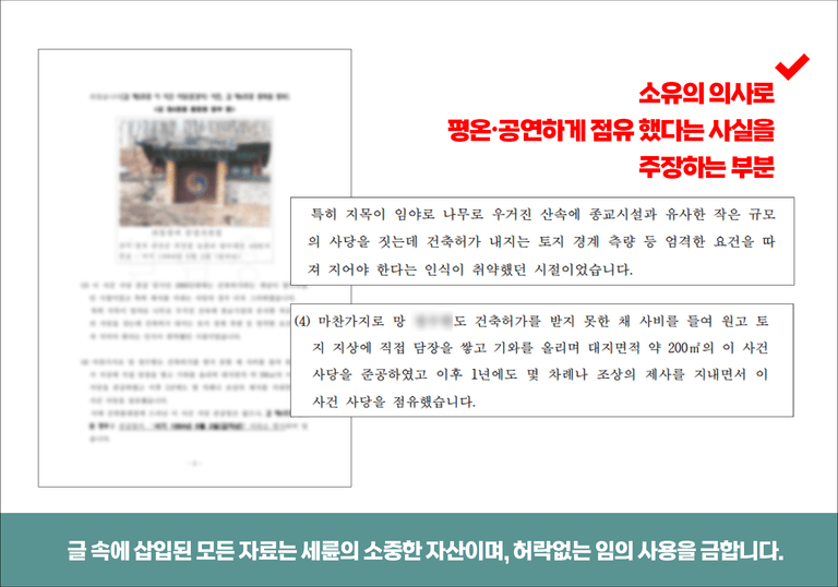 ✔️이 사당을 지을 당시는 1980년대 초반, 건축허가라는 개념이 열악하던 시절이었고, ✔️나무로 우거진 산 속에 작은 사당을 짓는데 건축허가를 내거나 토지경계측량을 하는 등의 엄격한 요건을 따라 지어야 한다는 인식이 취약했던 시절임을 고려 해달라고 주장하였습니다. 또한 의뢰인의 사당이 향교 등을 알리는 지역간행물에도 소개되어 이 사당을 지은 사람(X의 아버지)과 건립목적 등이 상세하게 설명되어 보도된 바가 있었기 때문에, 민법 제245조의 점유취득시효의 요건을 갖추었음을 입증하는데 총력을 다하였습니다.