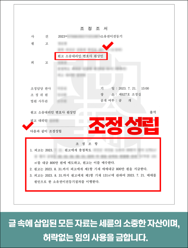 법원은 양 당사자의 의견을 고려하여 조정을 할 것을 결정했고, 저희 의뢰인이 토지를 저렴한 가격에 매수할 수 있도록 결정이 내려져 원할하게 조정이 성립되는 것으로 마무리 되었습니다.