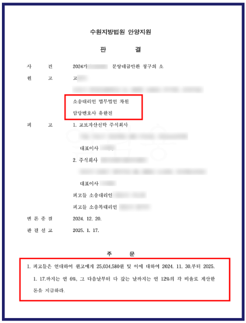 특히 앞서 사례처럼 경우에 따라선 계약금 손실을 감수해야 하는 상황도 생길 수 있기 때문에, 해지 과정에서 발생할 수 있는 경제적 부담을 최소화하고, 납입한 분양대금을 확실하게 돌려받기 위해서는 유사한 분양 분쟁 경험이 풍부한 변호사를 통한 전략적인 대응이 중요합니다.