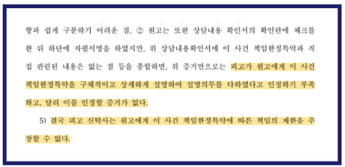 결국 수원지방법원은 해당 책임한정특약은 무효이며, 분양계약은 적법하게 해제되었으므로, 신탁사는 원고에게 분양대금 전액과 이에 대한 지연손해금을 반환하라는 취지의 원고 승소 판결을 선고하였습니다.