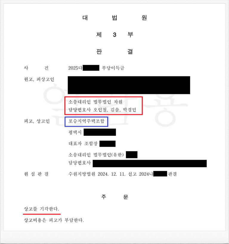 이번에도 재판부는 저의 주장을 받아들여, 피고 포승지역주택조합 측의 상고를 기각하였고, 결국 지역주택조합 분담금 반환 소송 대법원 최종 승소 판결을 이끌어 내었습니다.