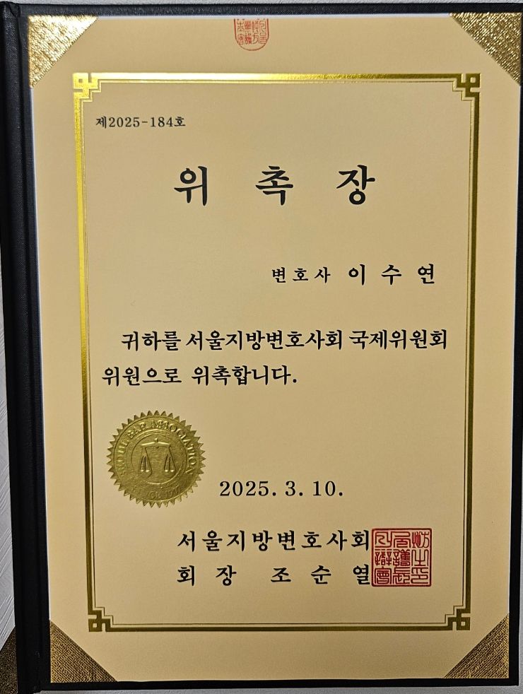 이수연 대표변호사가 2025년 서울지방변호사회 국제위원회 위원으로 위촉되었습니다.