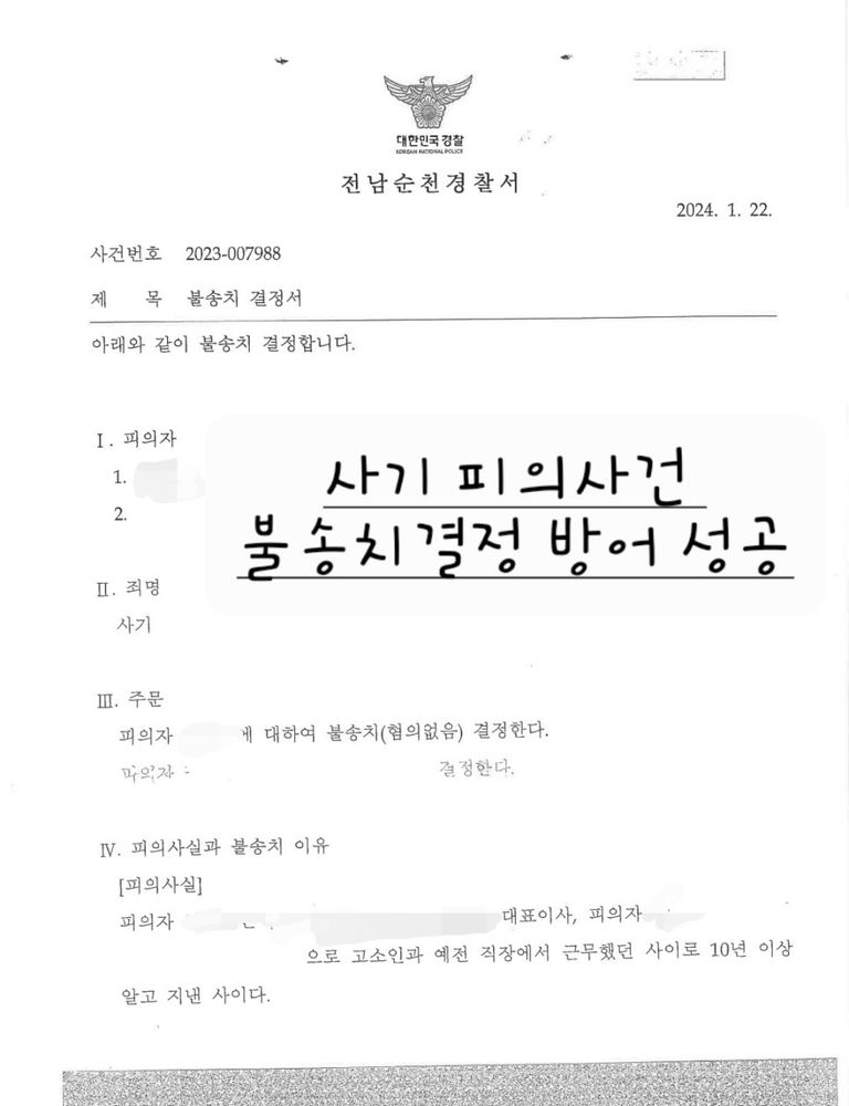 이수연 변호사가 억울한 고소를 당하신 의뢰인을 변호하여 '사기 혐의 없음' 불송치 처분을 받아낸 사례를 소개해 드리겠습니다.