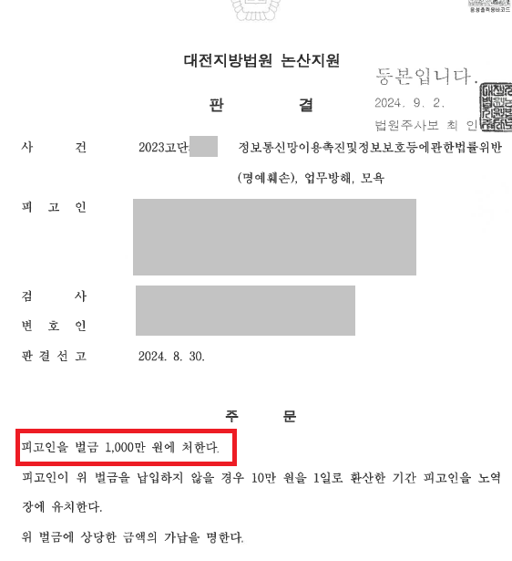 - 상대방은 명예훼손죄로 기소가 되었고 벌금 700만원의 유죄판결이 선고되었습니다