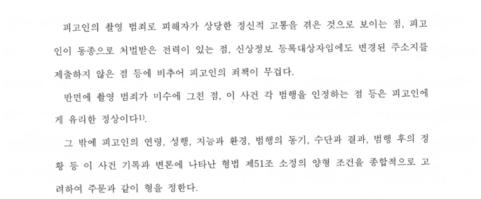 저는 피고인이 촬영을 한 사실이 없고, 미수에 그쳤다는 점, 수사기관에서 언급한 추가 카메라촬영죄에 대해서는 위법수집증거를 주장하였고, 그 점에 받아들여서 피고인의 카메라촬영 미수에 대해서만 기소가 되었습니다. 이 부분에 대해서는 범행을 모두 시인하고 피해자와의 합의를 시도하였으나 피해자가 합의를 완강히 거부하였습니다. 피해자에 대해서 형사공탁을 하는 등 나름의 노력을 보였지만 재판부는 형사공탁에 대한 효과를 부여하지는 않았습니다.