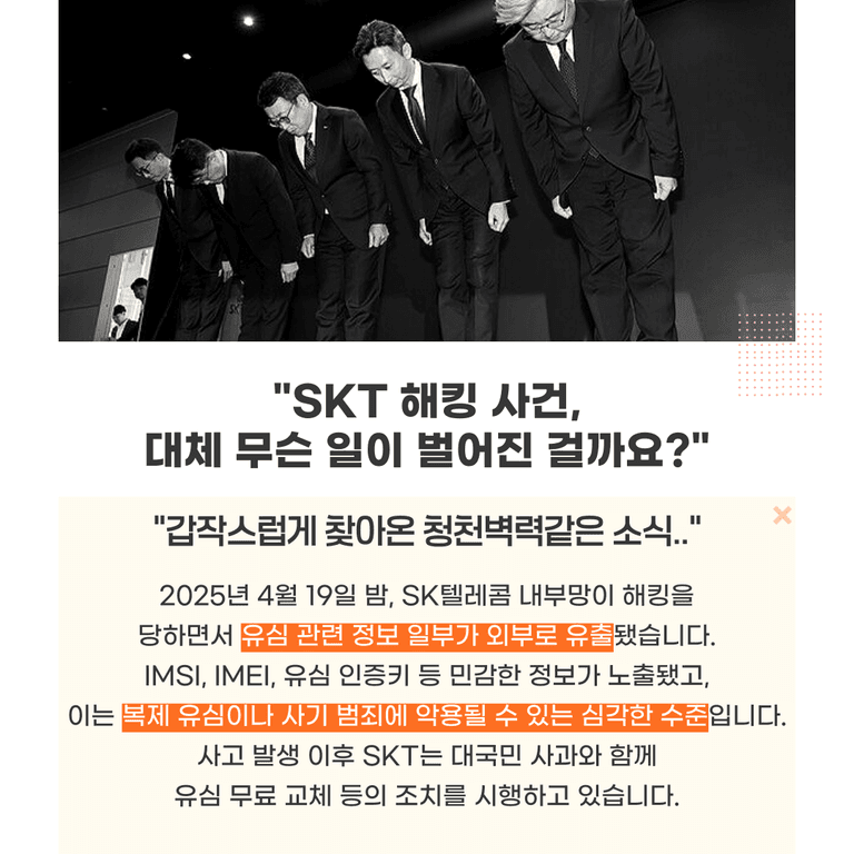 전 국민 절반 가까이가 쓰고 있는 SK텔레콤에서 유심 정보가 유출되는 해킹 사고가 발생했기 때문입니다.
