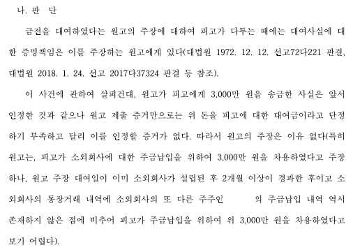 의뢰인은 자신이 '이사'로 있는 회사의 운영 자금 명목으로 원고로부터 의뢰인의 계좌로 금전을 지급 받았습니다. 의뢰인은 회사의 이사였을 뿐만 아니라 회사 주식 총 2만 주 중 9,800주를 소유하고 있었습니다.