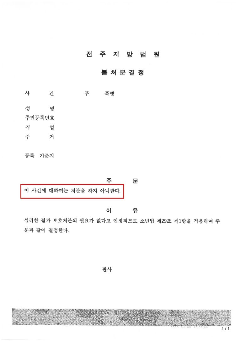 위와 같은 주장에 소년재판부는 한샘의 의견을 받아들여 불처분 결정을 내렸습니다.